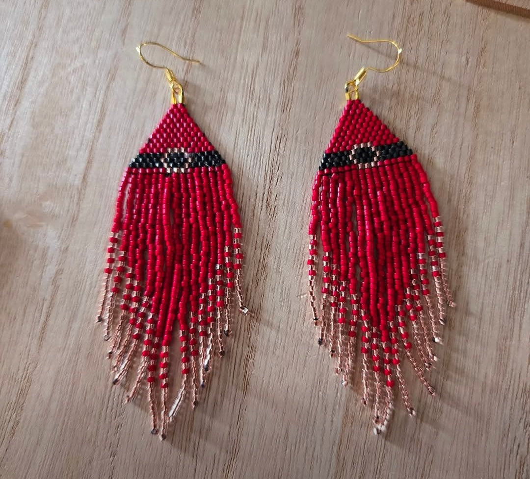 Hand-beaded with holiday spirit and a dash of drama, these earrings channel Santa’s bold charm and winter wonder. Red, black, and gold beads weave a tale of sleigh rides, secret gifts, and midnight magic. Lightweight yet striking, they’re perfect for festive gatherings, cozy nights, or gifting someone who deserves a little enchantment.